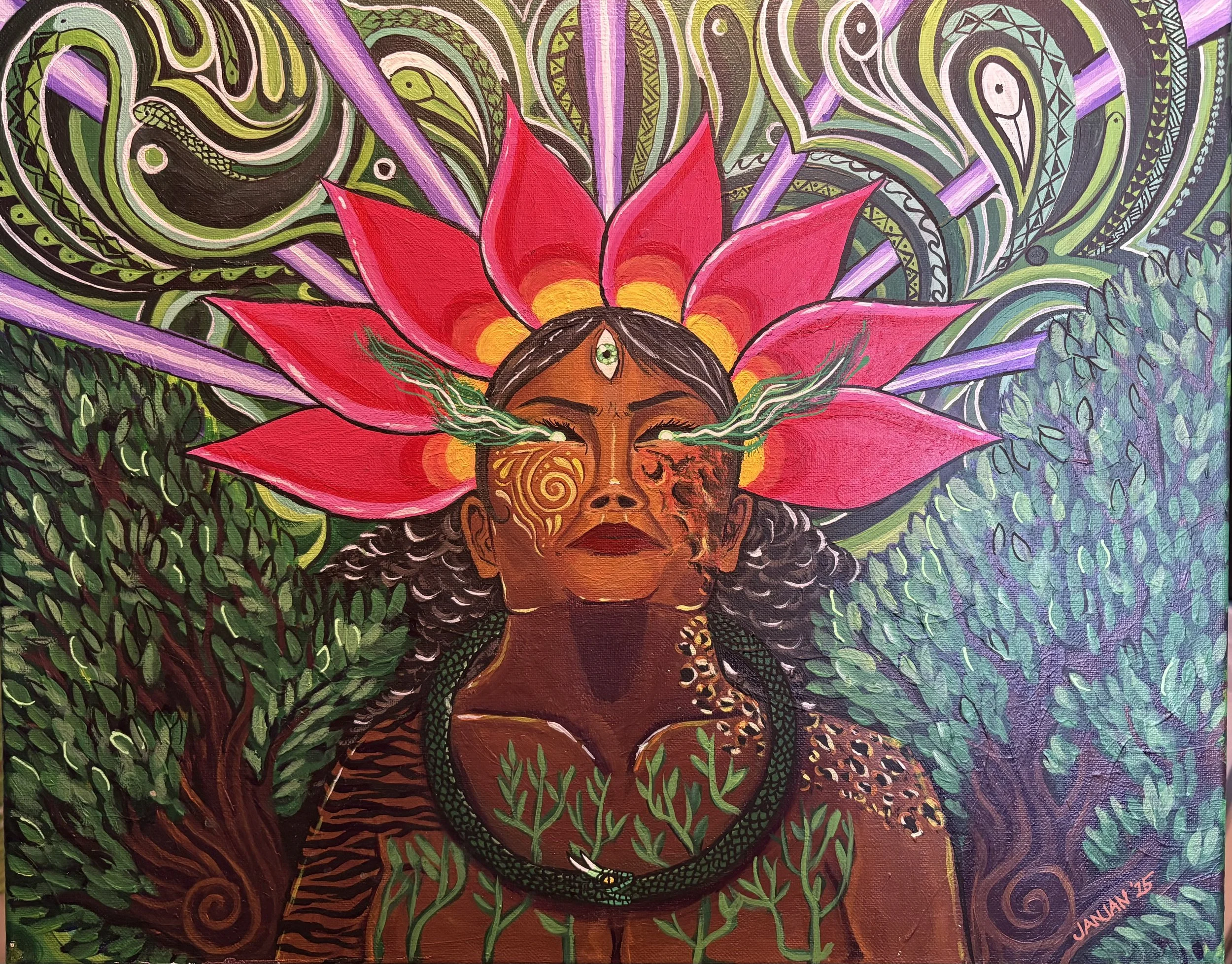 My art is a reflection of my emotions within. Painting, at first, became a therapeutic activity. Diagnosed with PTSD and major depression, I was finding healthy alternatives to cope with trauma. Painting was the only activity that seemed to “stick.” In the act of creation, I realized that my art is created involving my most important asset: my heart. Current day visionary artists such as Bill Bee, Alex Grey and past expressionist artists such as Van Gogh and Edvard Munch inspired me to lean towards the expressive visionary art styles. Growing up in Hawaii for 17 years, I took a strong interest in history, culture, religion and mythology. Hawaiian mythology and other pagan mythology revolving around feminine idols and goddesses became a huge inspiration for my own world with my own version of feminine idols and spirits in my paintings, often expressing a story behind my work. With storytelling, I have also made my own curated abstract patterned flow, and often appears within my expressive art pieces, creating an original piece of Janjan’s world. The message I hope to convey to my audience is how the experiences in my life have affected me emotionally and see how it translates onto a canvas.
